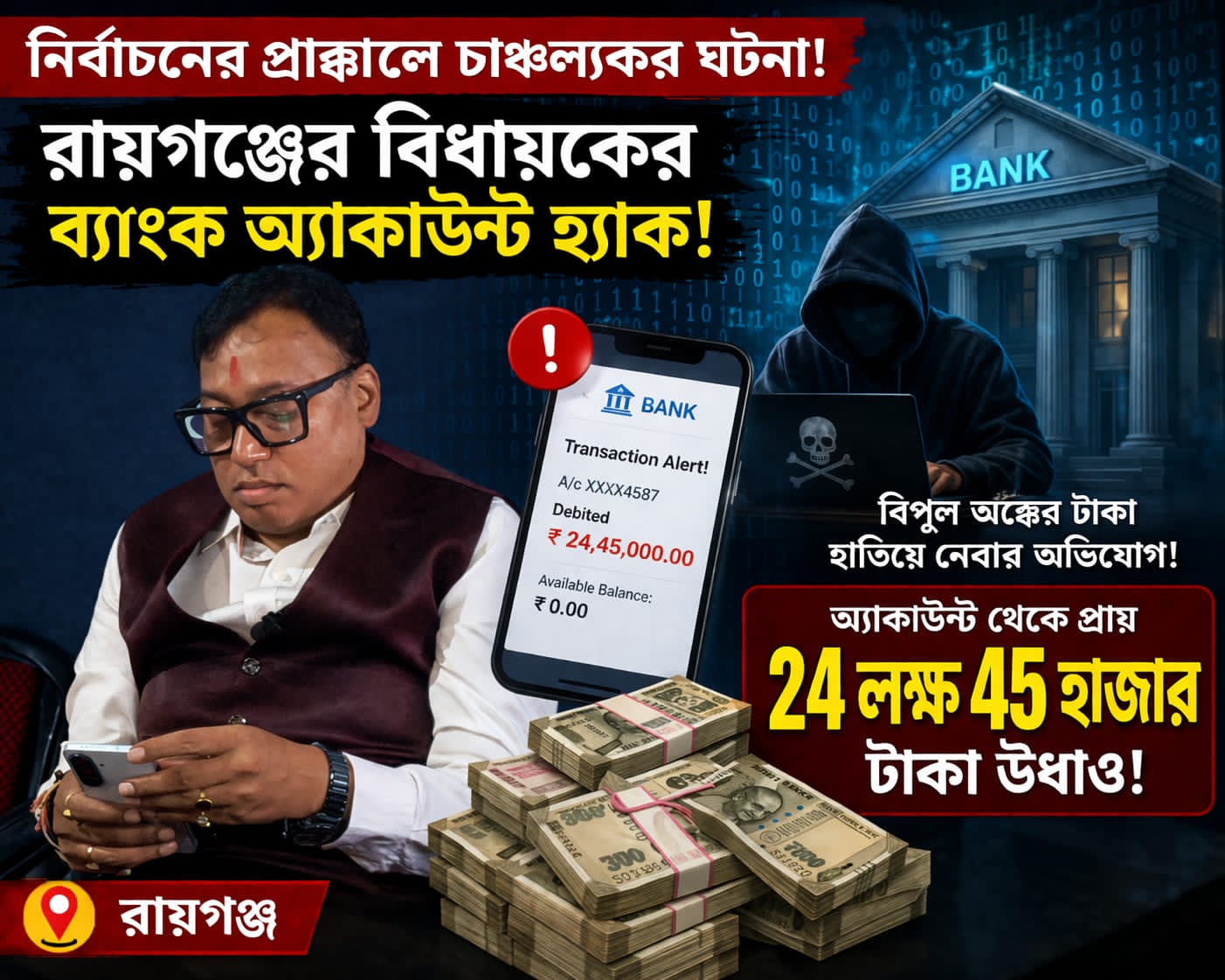 #চন্দ্র নারায়ণ সাহা, রায়গঞ্জঃ নির্বাচনের প্রাক্কালে চাঞ্চল্যকর ঘটনা। রায়গঞ্জের বিদায়ী বিধায়ক কৃষ্ণ কল্যানীর ব্যাঙ্ক অ্যাকাউন্ট হ্যাক করে বিপুল অঙ্কের টাকা হাতিয়ে নেওয়ার অভিযোগ উঠেছে। জানা